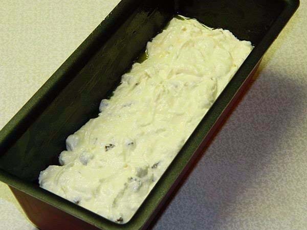 5. Topim untul pe baie de aburi. Tapetăm o tavă de copt cu jumătate din cantitatea de unt. Adăugăm compoziția de brânză și stafide, iar pe deasupra adăugăm uniform untul topit.