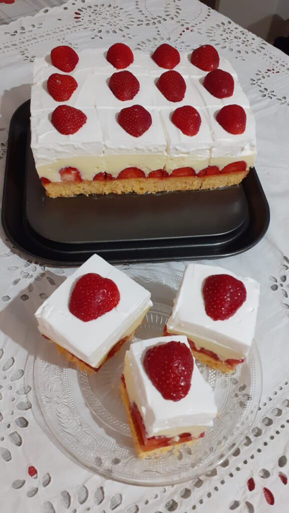 Această prăjitură se montează simplu: blat, strat generos de căpșuni proaspete, cremă fiartă aromată și frișcă bătută. Se taie ușor după câteva ore la rece și este potrivită atât pentru mesele în familie, cât și pentru invitați.