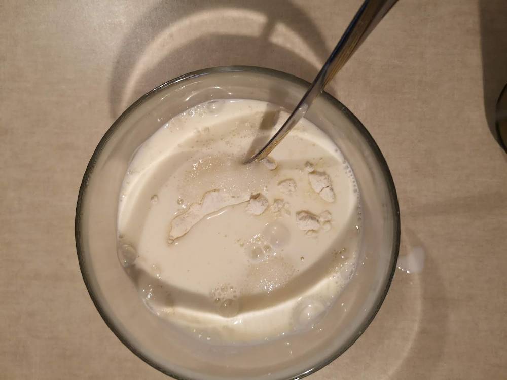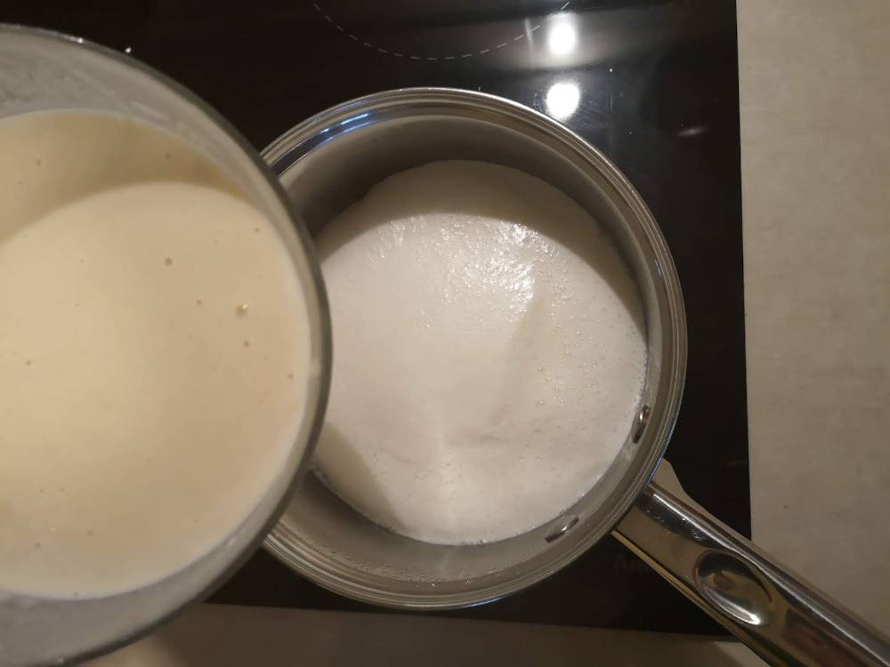 Pentru inceput punem la fiert 400 ml lapte. In 200 ml lapte adaugam faina de grau si zaharul. Amestecam bine.