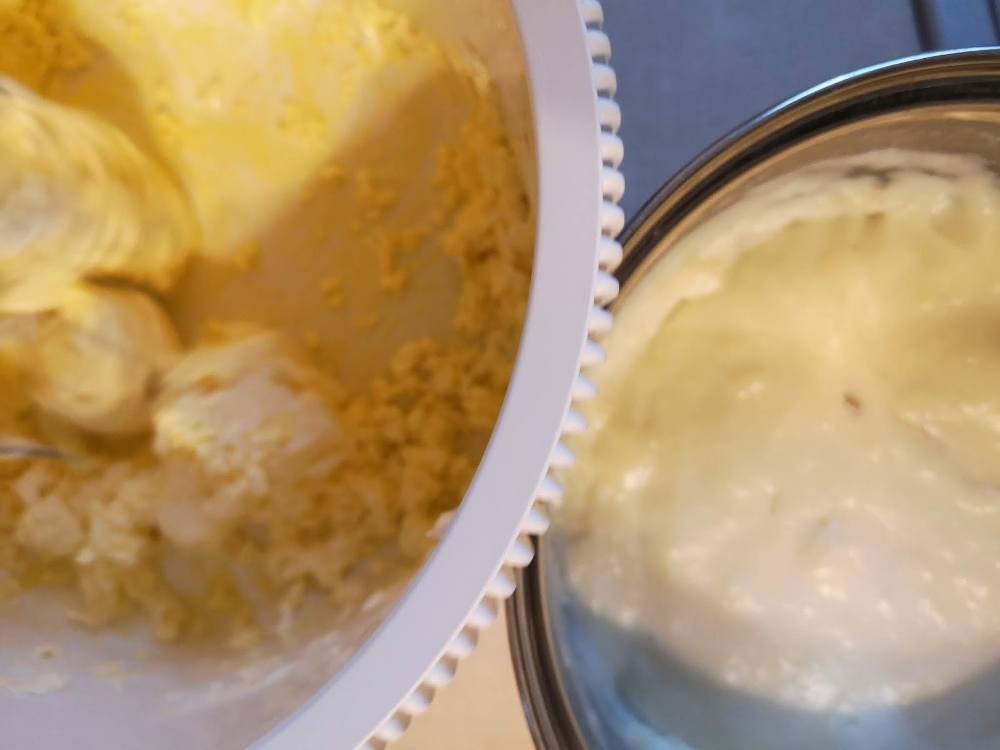 Batem untul cu un mixer. Adaugam galbenusurile si amestecam. Treptat, adaugam si budinca racita. Amestecam bine pana obtinem o crema omogena.