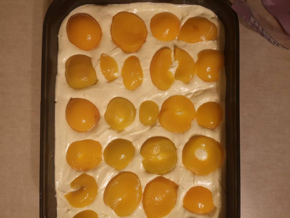 Turnam deasupra crema preparata anterior. Deasupra aranjam frumos piersicile din conserva.