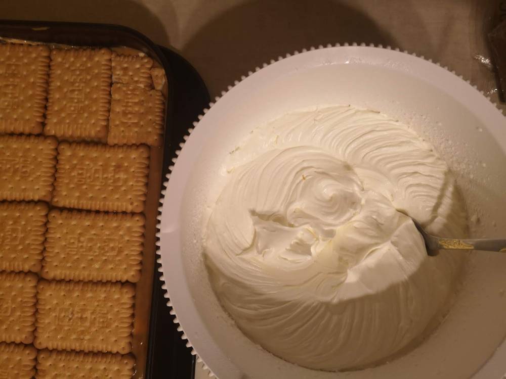 Batem smantana dulce cu zaharul pudra pana obtinem o frisca ferma. Intindem frisca peste cel de-al doilea strat de biscuiti.