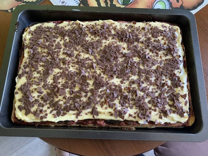 Scoatem blatul copt din tava si-l intoarcem invers. Prunele trebuie sa fie in partea de sus. Il ungem cu gem, apoi adaugam crema de budinca.