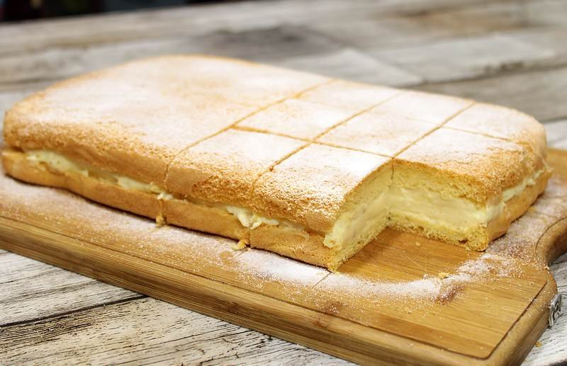 Taie blatul rece pe orizontala, astfel incat sa obtii doua blaturi mai subtiri. Pune primul blat pe o tava si umple-l cu crema de vanilie. Adauga cel de-al doilea blat si pune prajitura la frigider pentru 2 ore. Se presara zahar pudra deasupra, apoi se taie cubulete si se serveste. Pofta buna!