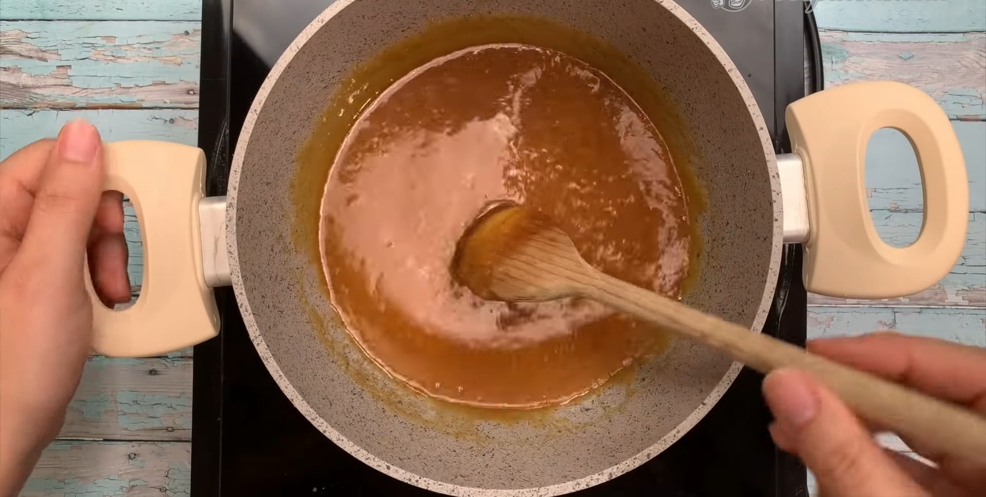 Pentru caramel, punem zahărul și apa într-o cratiță mai mică. Caramelizăm până obținem o culoare deschisă după care luăm de pe foc și adăugăm frișca lichidă. Punem înapoi pe foc și, amestecând continuu, topim caramelul. Încorporăm și untul și după omogenizare luăm de pe foc.