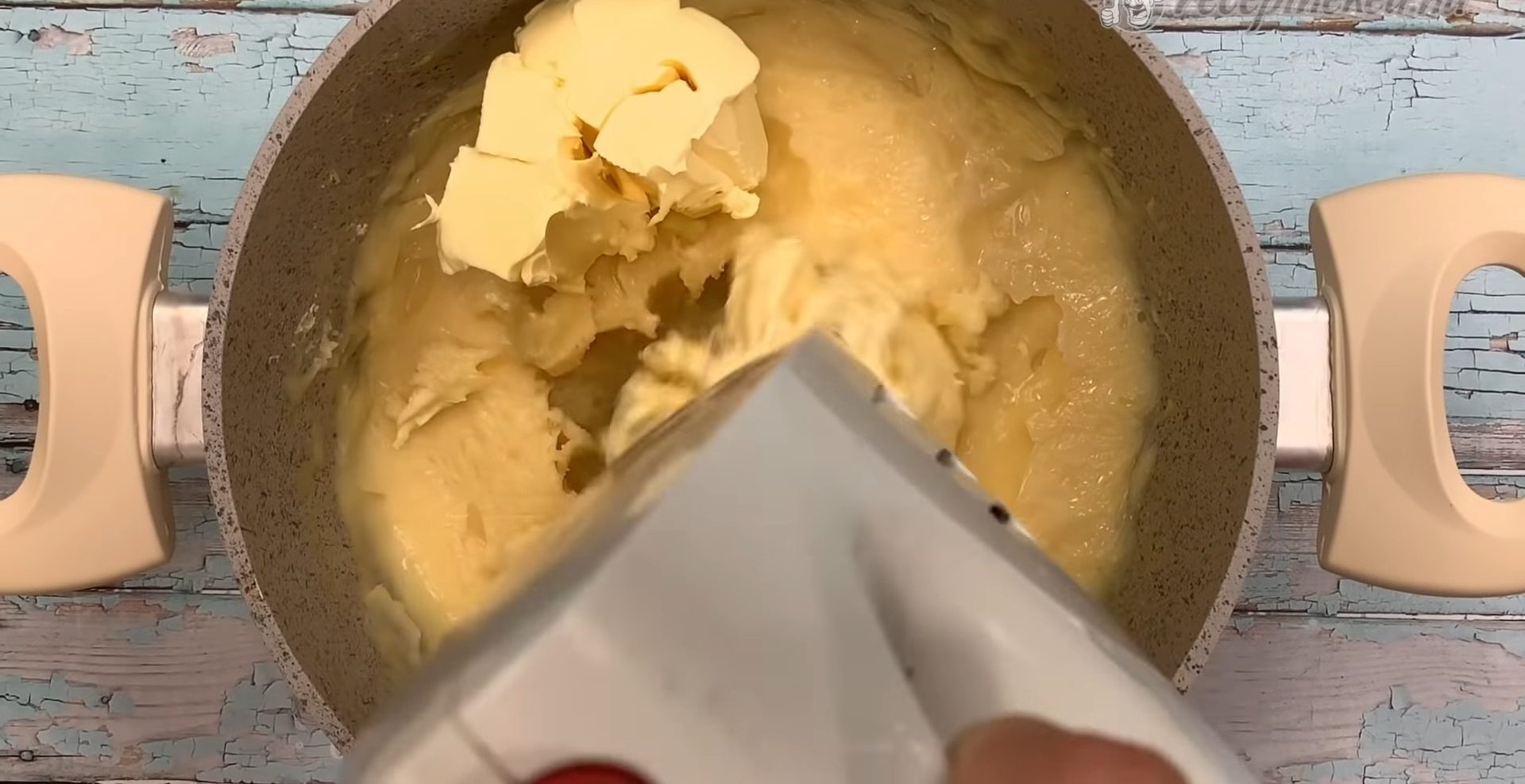 Pentru cremă, amestecăm gălbenușurile cu făina, amidonul, vanilia și zahărul. Treptat încorporăm și laptele și fierbem până crema se îngroașă. După ce se răcorește, încorporăm și untul și mixăm până obținem o consistență spumoasă.