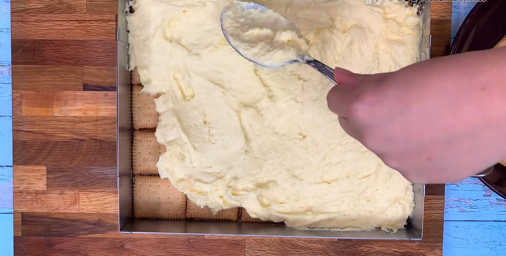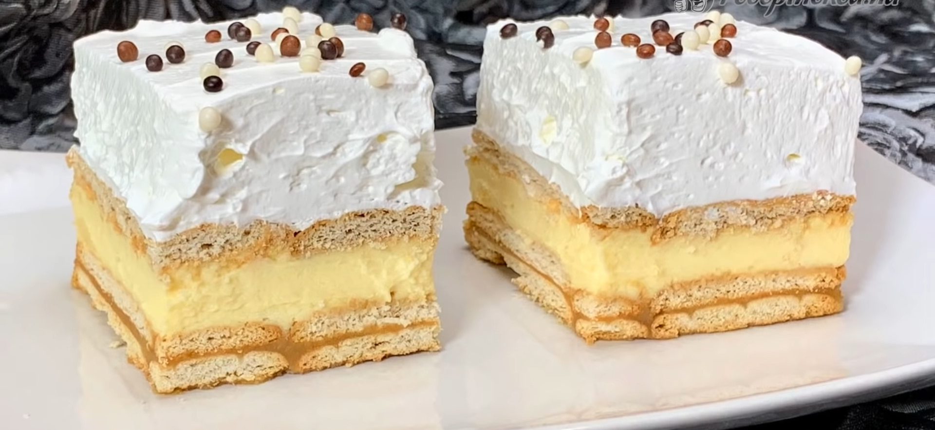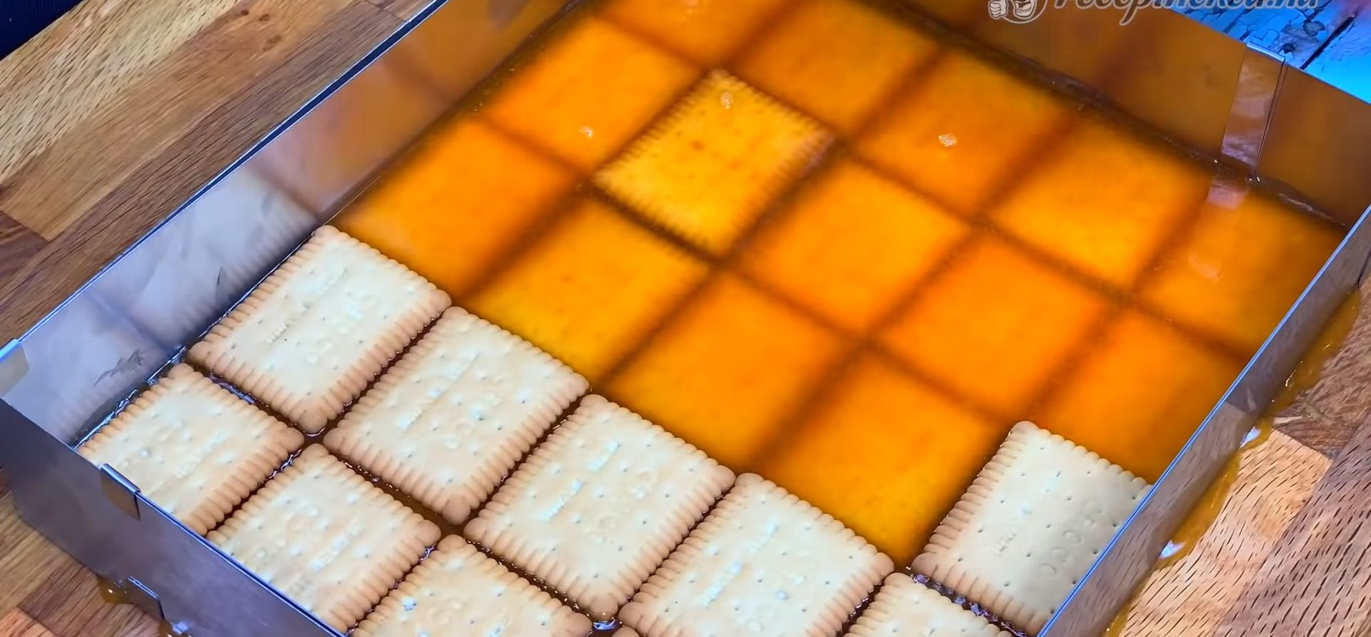 Punem 100 g de biscuiți la baza unei tăvi. Turnăm caramelul deasupra și acoperim cu încă 100 g de biscuiți. Peste biscuiți întindem crema de vanilie pe care o acoperim cu biscuiții rămași.