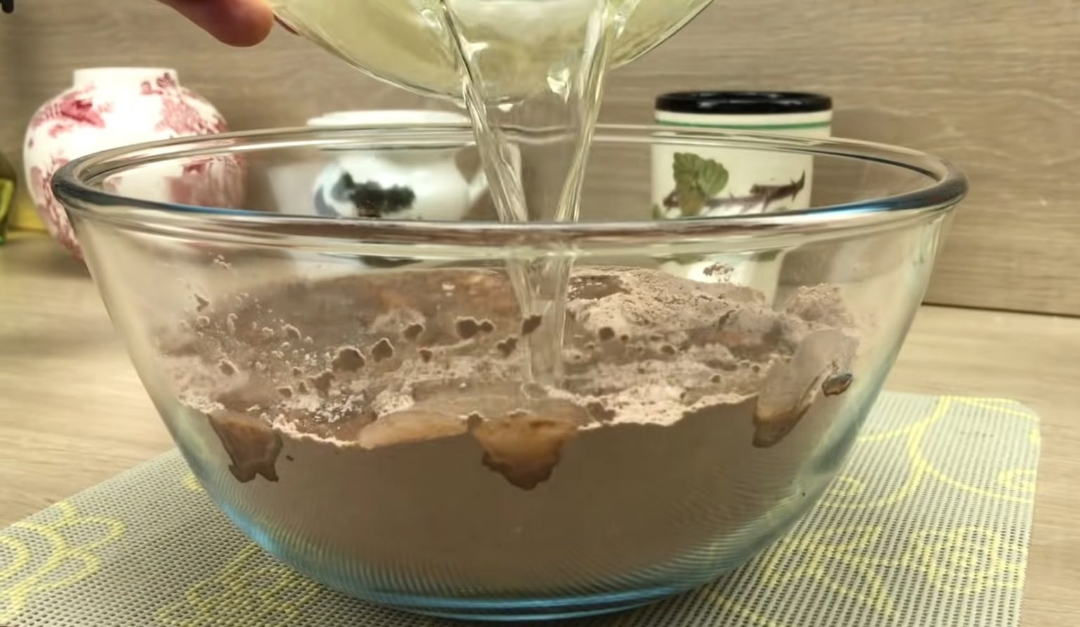 Turnăm apa într-un bol. Adăugăm uleiul, amestecăm cu telul. Într-un alt bol cernem făina și praful de copt. Adăugăm vanilia, pudra de cacao, zahărul, sarea și amestecăm foarte bine. Turnăm în bol amestecul de ingrediente lichide și mixăm până la omogenizare.