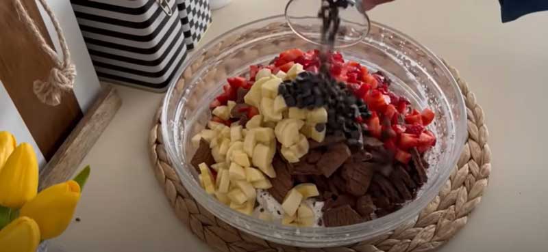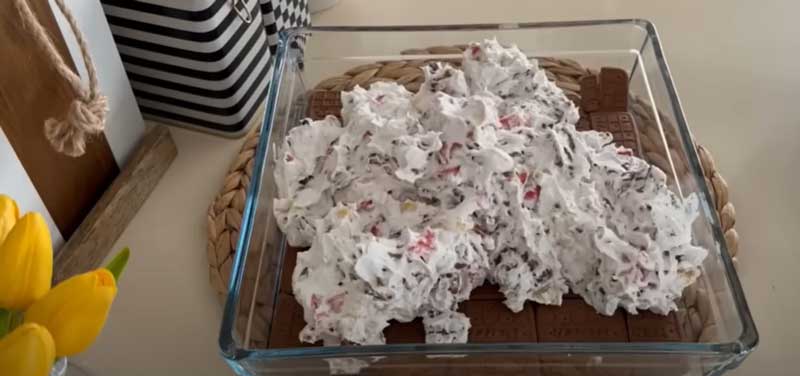 După adăugarea fulgilor de ciocolată si a biscuitilor, amestecați ingredientele bine. Așezați un strat de biscuiți în tavă și turnați toata crema peste acestia dupa care intindeti-o uniform.