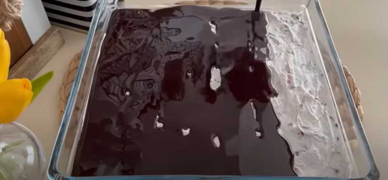 Puteți pune prăjitura la frigider în timp ce pregătiți toppingul de ciocolată. Încălziți frișca lichidă până când atinge punctul de fierbere pentru a pregăti sosul de ciocolată. Adăugați ciocolata în frișca încălzită și topiți-o.