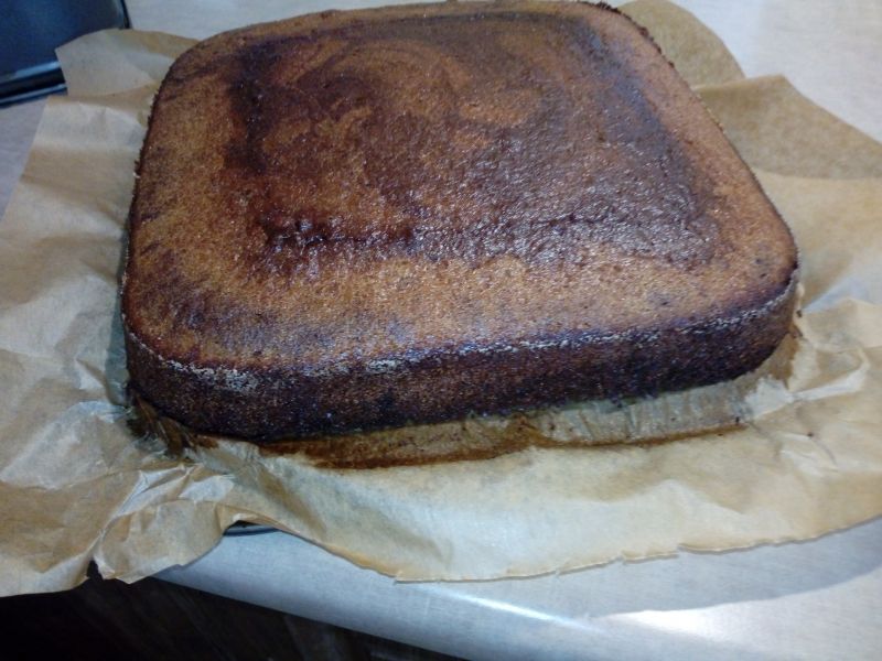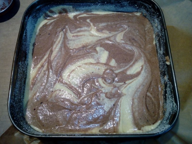 Turnam jumatate din amestecul obtinut intr-o tava dreptunghiulara tapetata cu hartie de copt. In celalalta jumatate adaugam cacao si amestecam. Turnam aluatul cu cacao peste cel din tava si amestecam cu o furculita.
