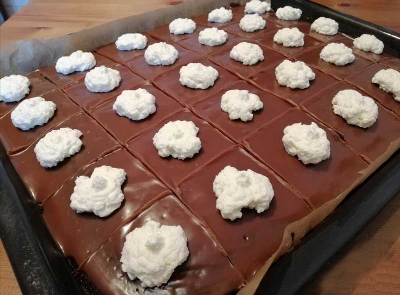 Turnați aluatul într-o tavă unsă cu unt și tapetată cu făină (aproximativ 46×26 cm). Coaceți la 180°C timp de 30 de minute.
