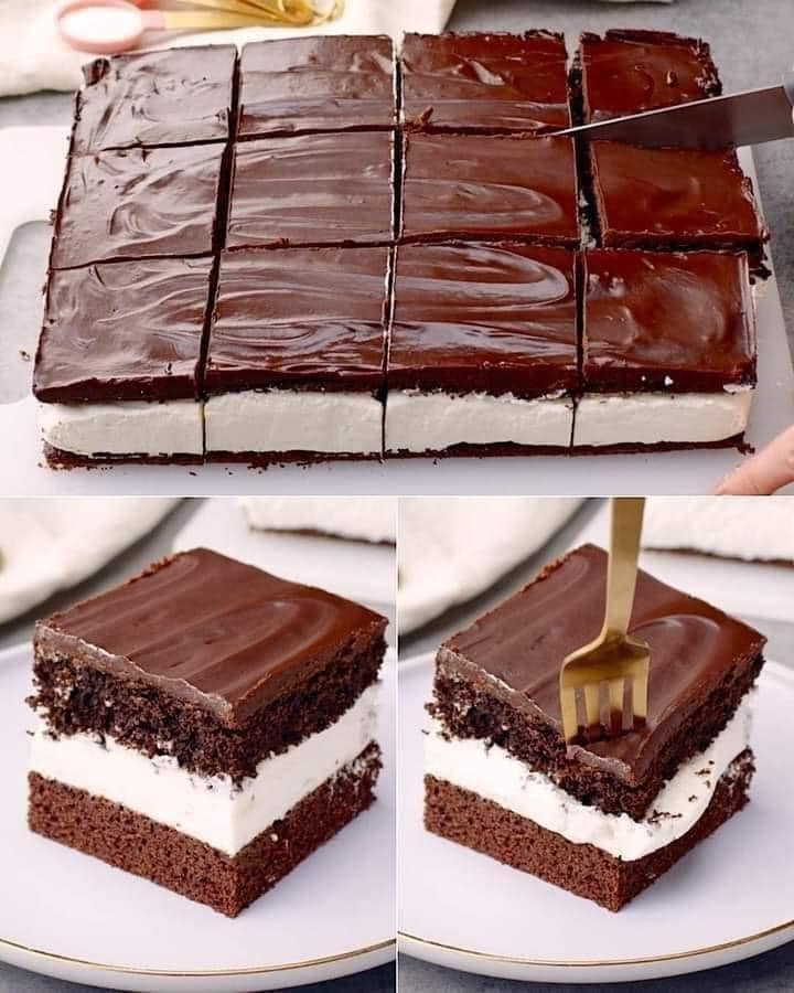 - Într-un bol se bat laptele condensat cu frișca lichidă, se adaugă gelatina și se toarnă în formă, se acoperă cu a doua bucată de blat de cacao.