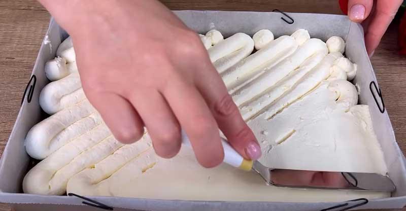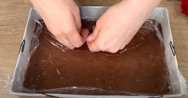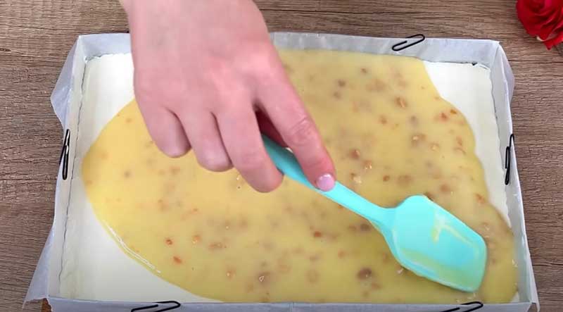 Întindeți uniform pe o tavă de copt cu dimensiunile 18×28 cm acoperită cu hârtie de copt. Acoperiți cu folie de plastic și bagati la frigider.