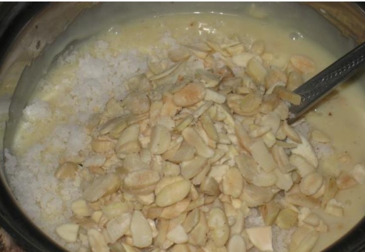 1. Intr-o cratita pusa la foc, turnam 100 ml de frisca lichida si laptele condensat pe care le amestecam, apoi adaugam laptele praf si fulgii de cocos.