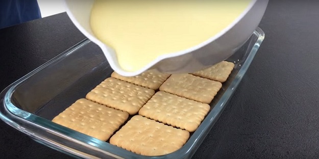 7. Amestecăm crema obținută cu untul pregătit anterior. Într-un vas adânc, adăugăm uniform un strat de biscuiți pe care îl tapetăm cu un strat de cremă.