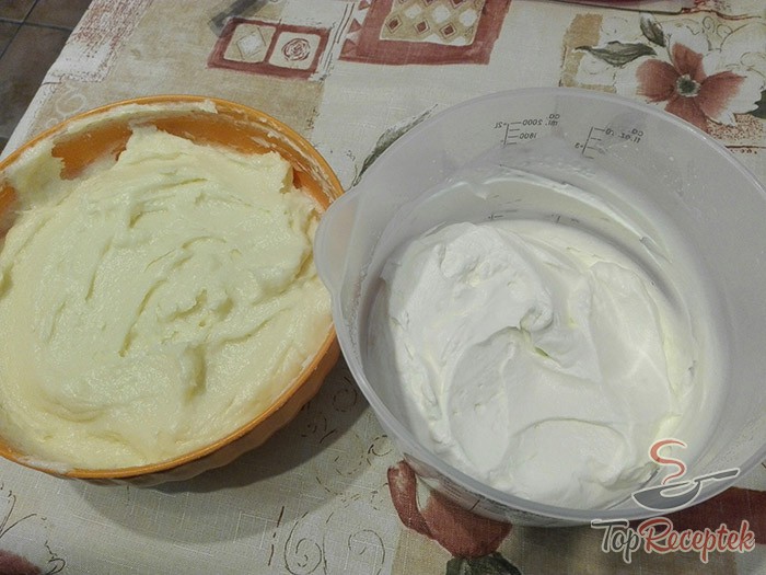 Lăsăm să se răcească. Mixăm spumă tare frișca lichidă.