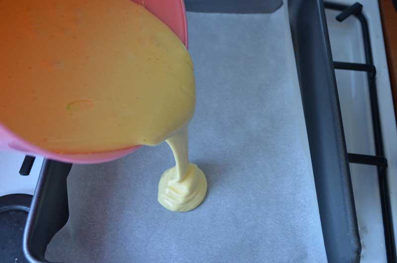 Bateți ouăle cu zahărul până devin o compoziție spumoasă, apoi adăugați zahărul vanilat și făina. Turnați compoziția într-o tavă tapetată cu hârtie de copt și coaceți la 180°C pentru 20-25 de minute.