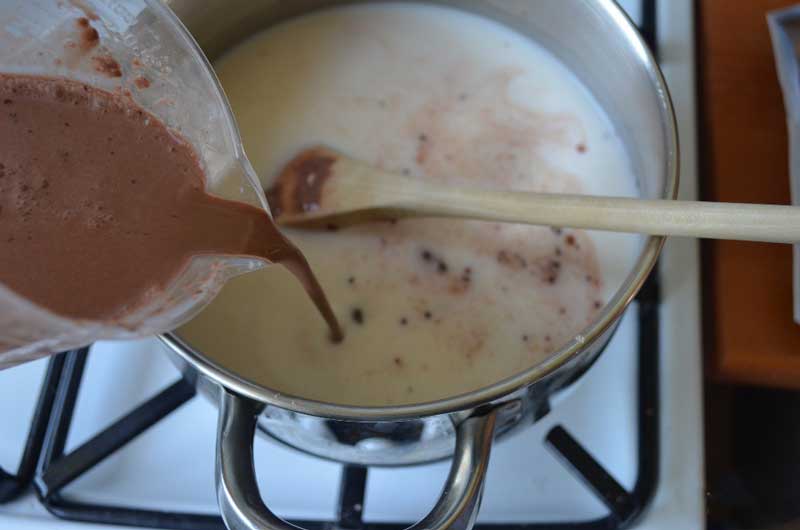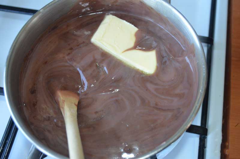În budinca fierbinte, adăugați ciocolata ruptă bucăți și amestecați până se topește complet. După ce ciocolata s-a topit, adăugați untul și amestecați bine.
