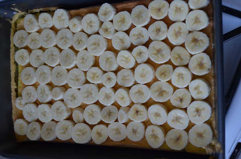 Asamblarea: Turnați crema peste blatul răcit și așezați felii de banane deasupra. Lăsați prăjitura la frigider câteva ore înainte de a servi.