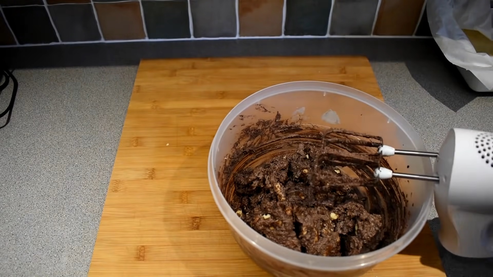 Transferăm budinca rece într-un bol mare. Adăugăm untul moale, pudra de cacao, esența de rom și mixăm până la omogenizare. Rupem în bucățele a doua foaie și punem în cremă. Amestecăm bine după care mixăm cu mixerul.