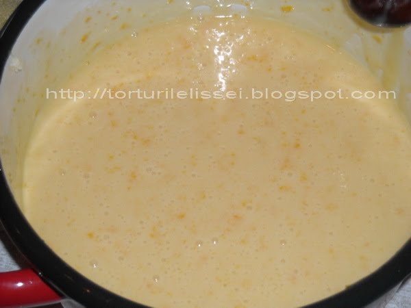 Se amestecă, la bain-marie, gălbenușurile, zahărul și laptele. Se amestecă bine, până se îngroașă… Așa fierbinte, am împărțit în două cratițe – în una am pus ciocolata albă, ruptă bucățele mici, și am amestecat bine, până s-a topit… apoi am pus sucul și coaja de lămâie… în cealaltă am pus ciocolata cu căpșuni, am amestecat până s-a topit și am lăsat la rece ambele creme…