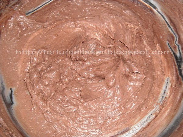 Se bate untul spumă și se împarte în două… jumătate se amestecă cu crema albă, iar jumătate se amestecă cu cacao și crema maro…