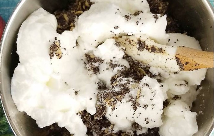 Intr-un vas adauga merele rase, semintele de mac si crema de galbenusuri cu unt si zahar pudra. Amesteca totul cu o spatula sau o lingura.