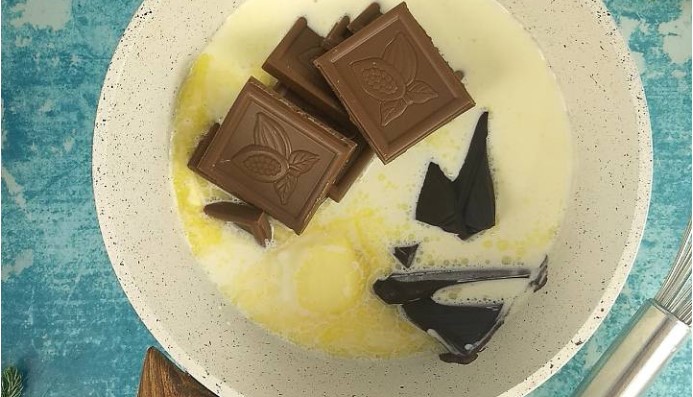 Amesteca totul cu o lingura pana cand cele doua tipuri de ciocolata si untul se dizvola complet in frisca lichida fierbinte si se formeaza o crema uniforma.