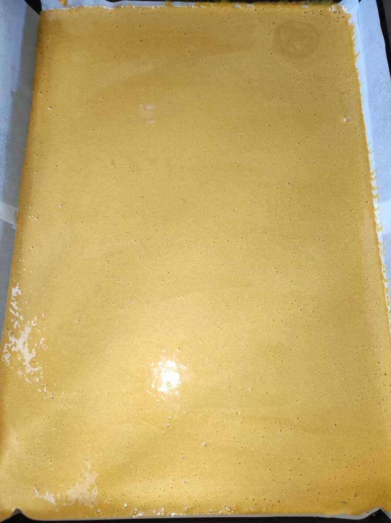 Turnați compoziția într-o tavă tapetată cu hârtie de copt (dimensiuni: 40×32 cm) și coaceți la 180°C timp de 12-13 minute. Fiți atenți, aluatul se coace foarte repede.