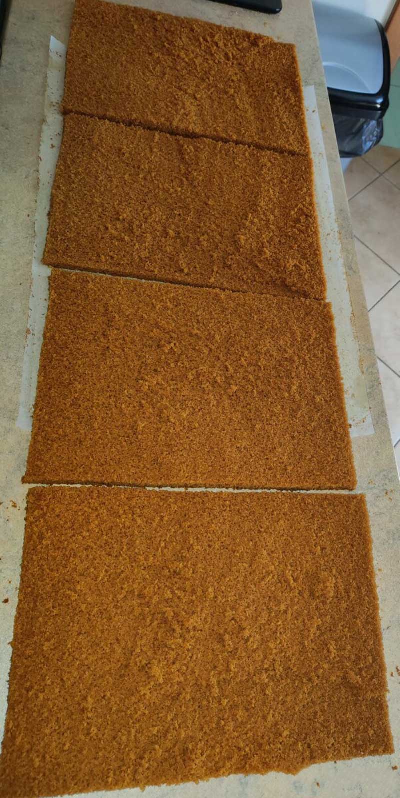Tăiați foaia în jumătate și apoi fiecare jumătate în alte două părți, obținând astfel 4 bucăți de blat.