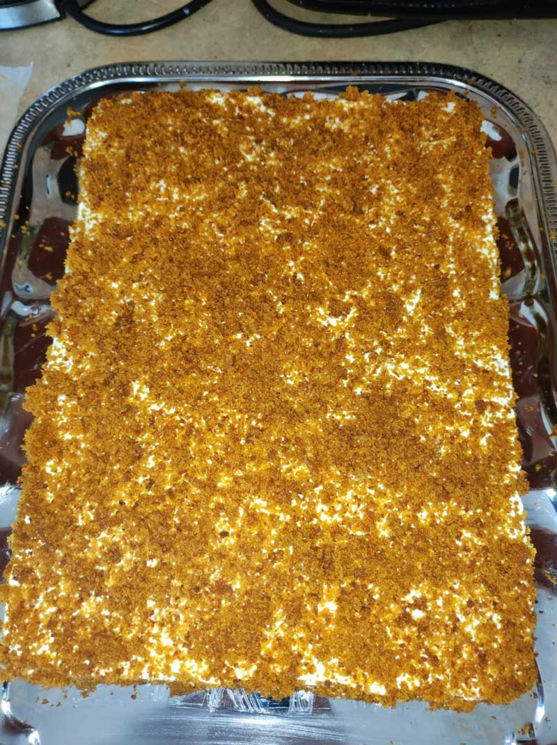 Ungeți blaturile cu cremă, iar marginile tăiate inițial le zdrobiți și le presărați peste margini și deasupra prăjiturii.