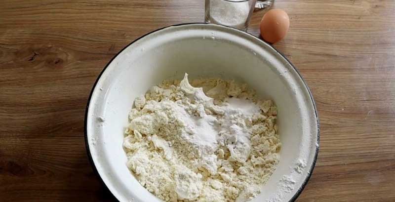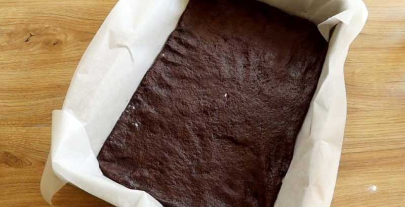 Pregătim baza prajiturii – cernem faina de grau si radem 100 g de unt răcit (din cele 500 gr) si se adauga praful de copt. Adăugați 90 g zahăr, ou, smântână și pudră de cacao. Se framanta un aluat moale omogen.