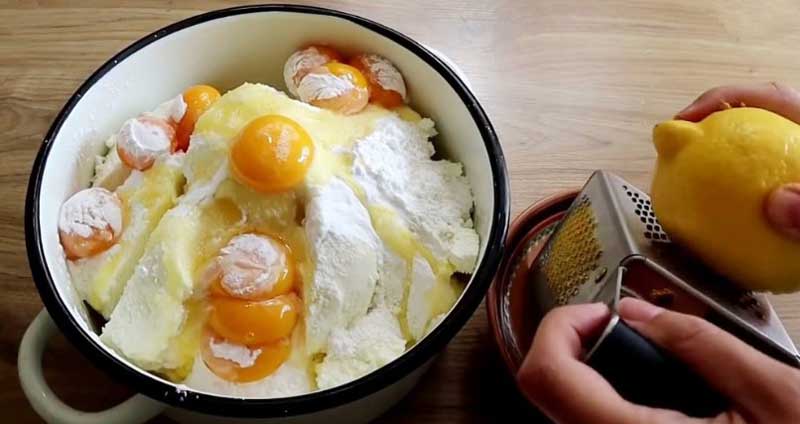 Pregătiți crema de branza – daca folositi branza de vaci, faceti-o piure cu ajutorul unei furculite iar daca folositi o crema de branza obisnuita, lasati-o asa. Peste aceasta se toarnă 400 g zahăr, gris, 70 g amidon de porumb. Adăugați zahărul vanilat, 10 gălbenușuri, 100 g de unt topit și coaja de lămâie rasă. Bate totul până la omogenizare.