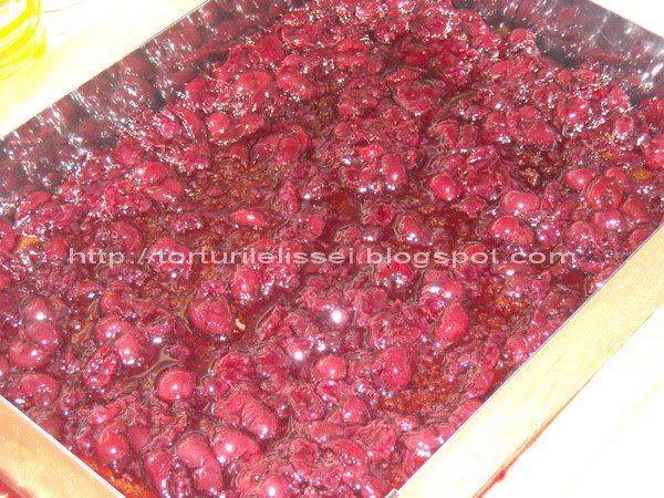 Peste blatul însiropat, am pus un jeleu de vișine, pe care l-am făcut așa…