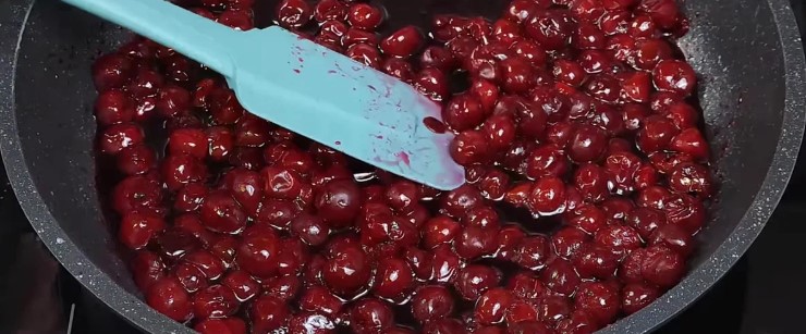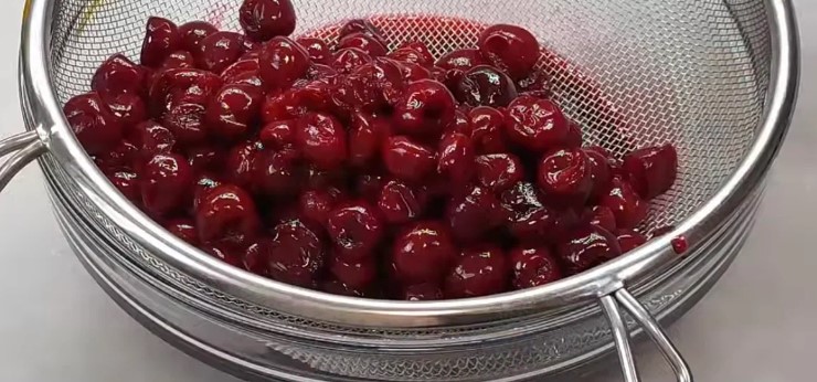 Se pun cireșe într-o tigaie, se acoperă cu zahăr și se pun pe foc. Aduceți la fiert și gătiți încă cinci minute dupa care se pun intr-o sita/strecuratoare.