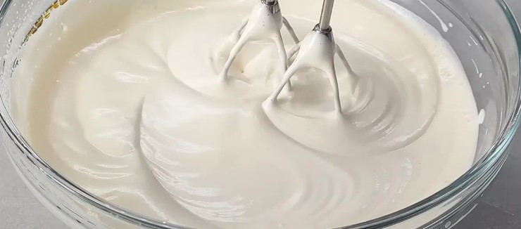 Intr-un bol, adăugați smântâna, zahărul, crema de brânză și bateți cu un mixer pana cand se omogenizeaza perfect si crema devine stabila.