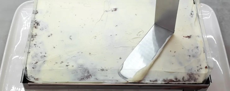 Punem prajitura in forma si o insiropam cu sirop de cirese, apoi intindem crema si nivelam. Puneți fructe deasupra si repetati procedeul cu blat-crema-fructe pana cand ultimul blat va fi acoperit doar cu un strat de crema alba.