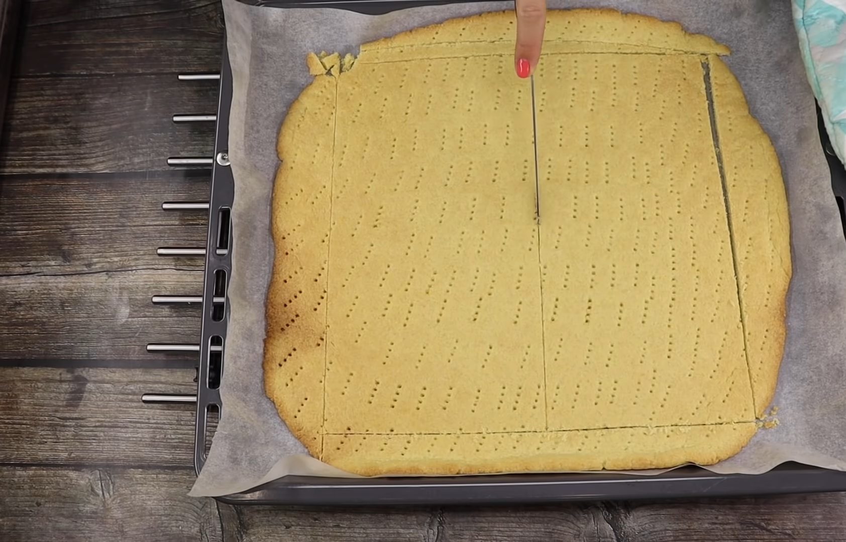 Transferăm blatul, cu tot cu hârtia de copt, pe o tavă. Înțepăm blatul cu furculița și dăm tava la cuptorul preîncălzit la 200 de grade, timp de 10-12 minute sau până marginile se rumenesc.