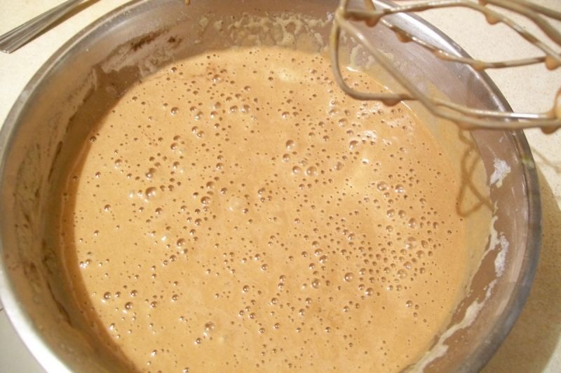 Pregatim prima oara blatul de cacao. Separam albusurile de galbenusuri. Batem albusurile pana obtinem o spuma ferma. Adaugam treptat zaharul si continuam sa batem. Adaugam apoi galbenusurile, unul cate unul, apoi adaugam faina amestecata cu praful de copt si cacaoa.