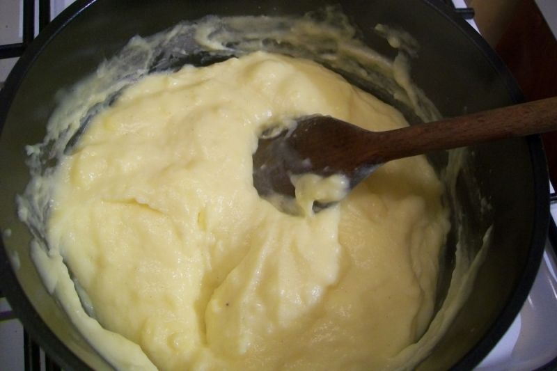 Pentru a prepara crema, punem la fiert intr-o cratita 400 ml lapte si 2 linguri de zahar vanilat. In laptele ramasa adaugam galbenusurile, faina de grau si faina de cartofi. Fierbem budinca pana se ingroasa apoi o lasam sa se raceasca.