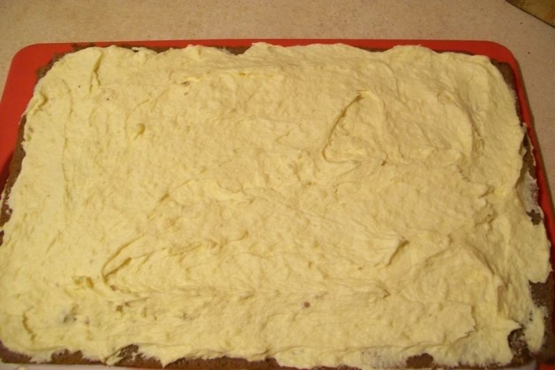 Batem untul cu zahar pana devine pufos. Adaugam budinca racita in unt si amestecam. Peste primul blat de cacao punem jumatate din crema de budinca.