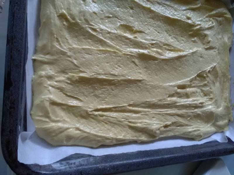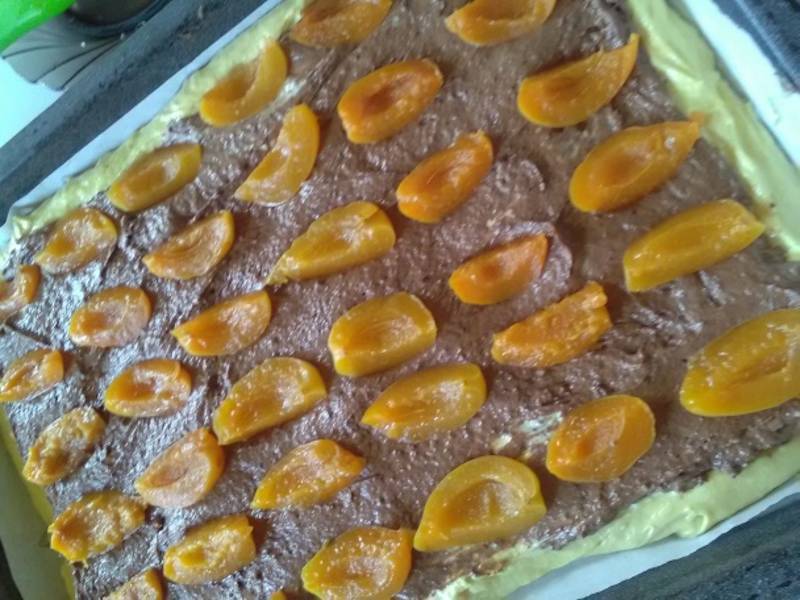 Batem albusurile spuma, apoi le adaugam in aluat. Amestecam bine. Impartim aluatul in doua. Adaugam 3 linguri de suc de caise in jumatate de aluat. Turnam aluatul intr-o tava dreptunghiulara (41×31 cm) tapetata cu hartie de copt.In cealalta jumatate de aluat adaugam cacao. Amestecam bine. Turnam aluatul de cacao in tava, peste celalalt aluat.