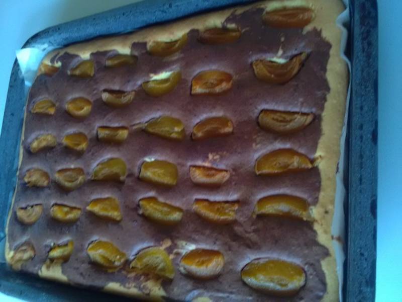 Taiem caisele din compot si le punem in tava, peste aluatul de cacao. Bagam tava in cuptorul preincalzit la 220 grade si coacem blatul timp de 20-25 de minute. Dupa ce s-a copt, il scoatem din cuptor si-l lasam sa se raceasca. Indepartam hartia de copt.Dizolvam praful de budinca in 100 ml compot de caise. Sucul din compot care a mai ramas, il punem la fiert. Cand fierbe, adaugam budinca si amestecam pana se ingroasa.