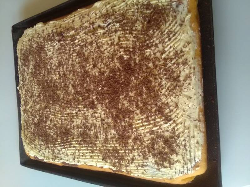 Luam budinca de pe foc si o lasam sa se raceasca. Batem untul cu mixerul pana devine pufos, apoi il combinam cu budinca groasa. Intindem crema obtinuta peste blatul rece. Presaram ciocolata rasa peste crema si bagam prajitura la frigider pentru cateva ore, dupa care o putem taia si servi.Pofta buna si spor la gatit!