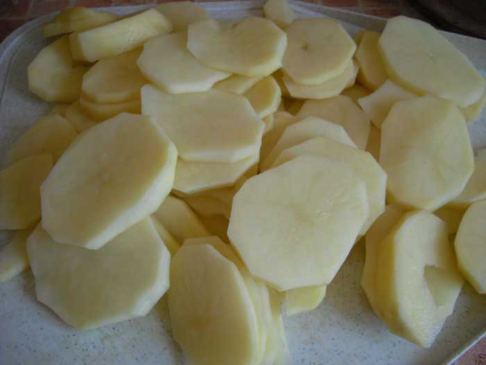 2. Într-o tavă de copt tapetată cu ulei, adăugăm cartofii tăiați rondele.