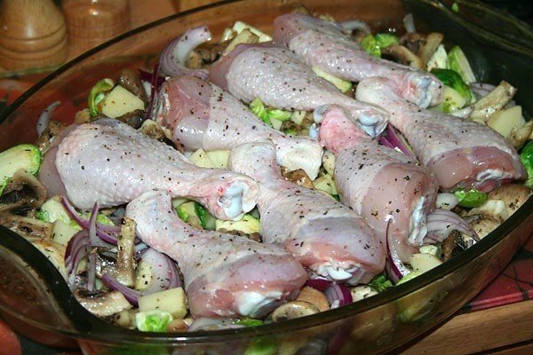 5. Pulpele de pui le condimenăm după bunul plac, pe urmă le adăugăm peste stratul de legume.