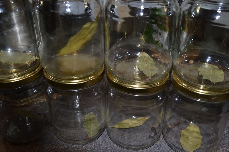 3. Sterilizăm 4 borcane de 800 ml. Adăugăm câte o frunză de dafin în fiecare.