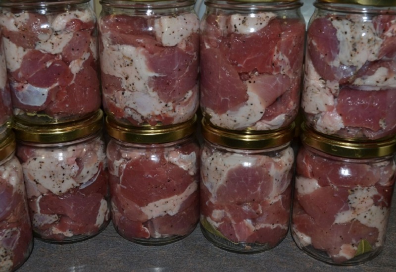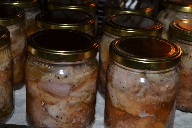 4. Adăugăm carnea în borcane, pe urmă le umplem cu apă și le sigilăm.