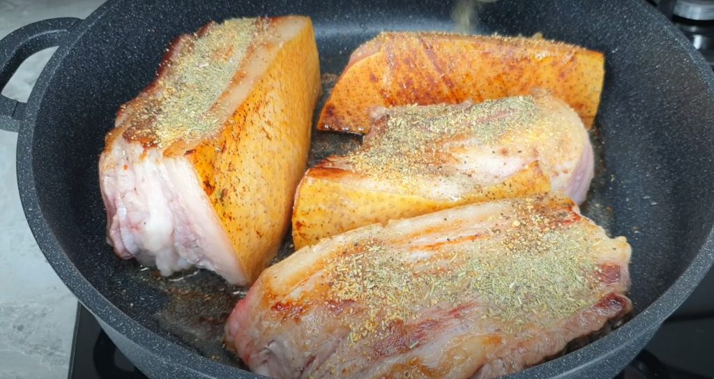 Spălăm pieptul de porc și îl uscăm cu prosoape de hârtie, îl tăiem în bucăți mari și le punem într-o tigaie adâncă. Le prăjim pe foc mare până devin aurii pe ambele părți, câte 2 minute fiecare.